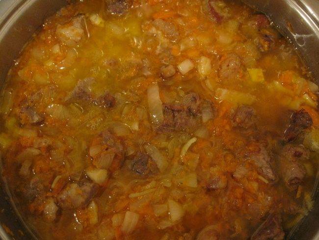 Бросить мясо в сковороду и жарить, пока объём вина не уменьшится вдвое. Залить 300-400 мл куриного бульона и рубленые свежие травы. Посолить, поперчить. Сделать огонь на минимум и тушить под крышкой 1,5 часа, периодически помешивая. Затем снять крышку и готовить ещё около 20-30 минут. При необходимости можно добавлять ещё бульон. -