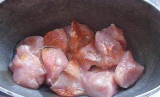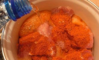 Мясо свинины порезать. Я порезала довольно крупными кусками (примерно 2-3 см). Сложить в сотейник. Посолить, добавить паприку, налить газированной воды.