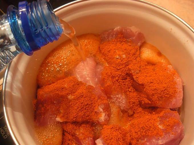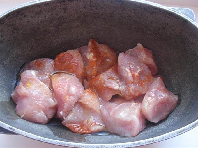 Мясо свинины порезать. Я порезала довольно крупными кусками (примерно 2-3 см). Сложить в сотейник. Посолить, добавить паприку, налить газированной воды.