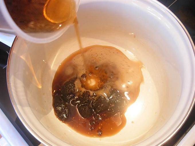 Готовим глазурь: в сотейник наливаем пиво, уксус, соль, сахар. Выпариваем минут 20, пока не останется треть от первоначального объема.
