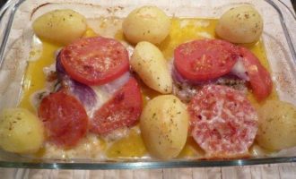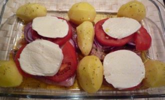 А в завершении — сыр. Вокруг выложить картошку, смазать ее оливковым маслом и посыпать орегано. Запекать в духовке 30 мин.