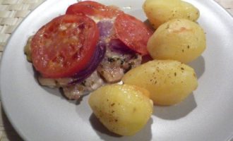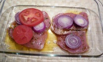Разогреть духовку до 200°C. На смазанный маслом противень выложить куски свинины, сверху лук, затем помидор…