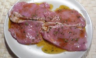 Свинину замариновать на 2 часа в оливковом масле со специями.