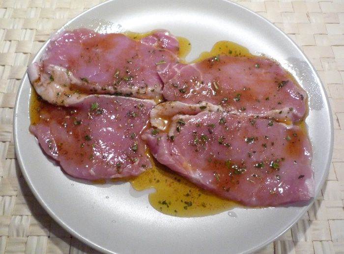 Свинину замариновать на 2 часа в оливковом масле со специями.