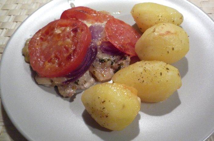 Разогреть духовку до 200°C. На смазанный маслом противень выложить куски свинины, сверху лук, затем помидор…
