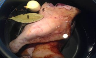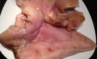 • Свиное ухо хорошо помыть и отварить примерно1-1,5 часа вместе с луковицей, морковью и специями. Я делала это в мультиварке на режиме «Тушение» 2 часа…