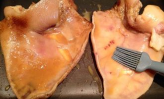 Запекать ухо в разогретой до 180 градусов духовке примерно 60-70 минут. Каждых 10 минут тщательно смазывать ухо глазурью, для образования золотистой корочки. Подавать горячим.