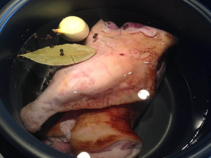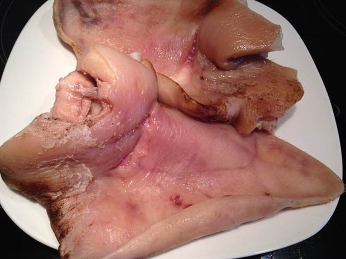 • Свиное ухо хорошо помыть и отварить примерно1-1,5 часа вместе с луковицей, морковью и специями. Я делала это в мультиварке на режиме «Тушение» 2 часа…