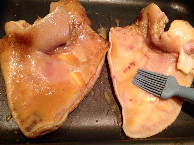 Запекать ухо в разогретой до 180 градусов духовке примерно 60-70 минут. Каждых 10 минут тщательно смазывать ухо глазурью, для образования золотистой корочки. Подавать горячим.
