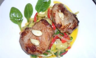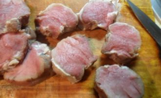 Филейную часть свинины нарезать на кусочки толщиной 2 см. При желании можно обернуть по кругу фольгой, чтобы медальон держал форму, я не делала, так как готовила просто на ужин.