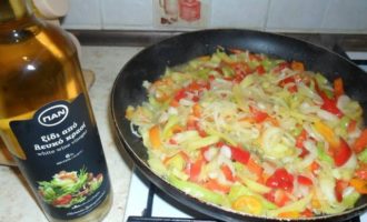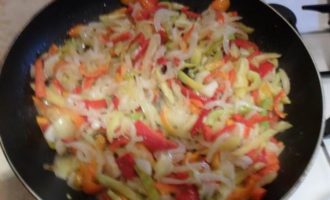 На небольшом количестве масла и большом огне обжарить нарезанный лук и перец, сразу добавить сахар, чтобы карамелизировать овощи.