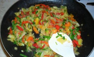 Мелко нарезать базилик и я еще добавила немного черемши, и добавить к перцу. Снять с огня.