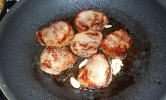 Обжарить на растительном масле по 3-4 минуты с каждой стороны, после того как перевернете, посолите и поперчите, и киньте в сковороду чеснок, целым. Снять с огня и накрыть фольгой, чтобы не остыли.