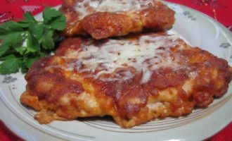 Мясо панировать сначала в муке, затем в кляре. Жарить на разогретой с маслом сковороде. Сначала с одной стороны на среднем огне без крышки. Затем перевернуть, накрыть крышкой и жарить на маленьком огне до готовности. Готовые отбивные посыпать тёртым сыром (50 г) и подавать на стол.