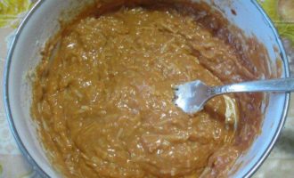 Для кляра смешать яйца, натёртый на мелкой тёрке сыр (60 г), муку и томатную пасту. Муки может вам понадобиться большее или меньшее количество.