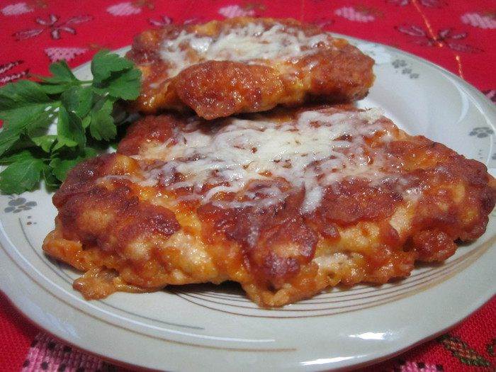Мясо панировать сначала в муке, затем в кляре. Жарить на разогретой с маслом сковороде. Сначала с одной стороны на среднем огне без крышки. Затем перевернуть, накрыть крышкой и жарить на маленьком огне до готовности. Готовые отбивные посыпать тёртым сыром (50 г) и подавать на стол.
