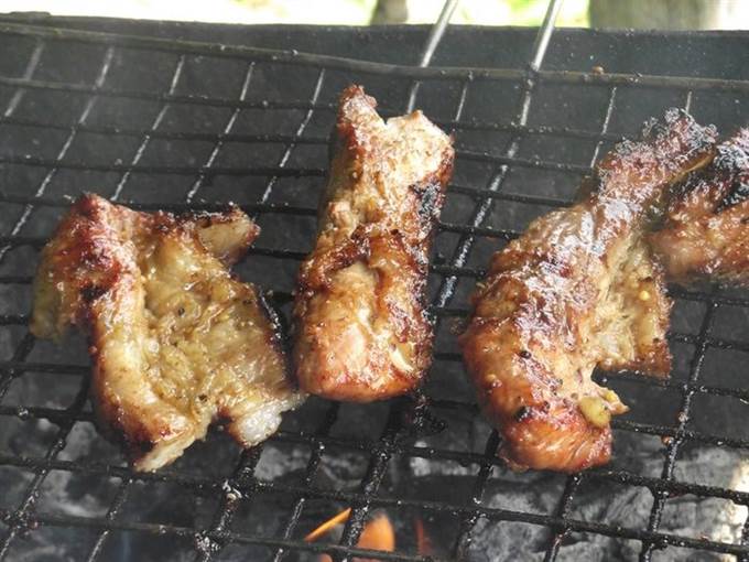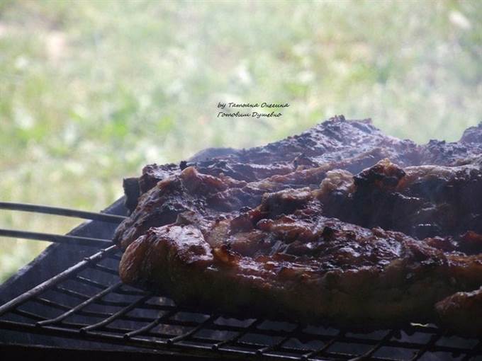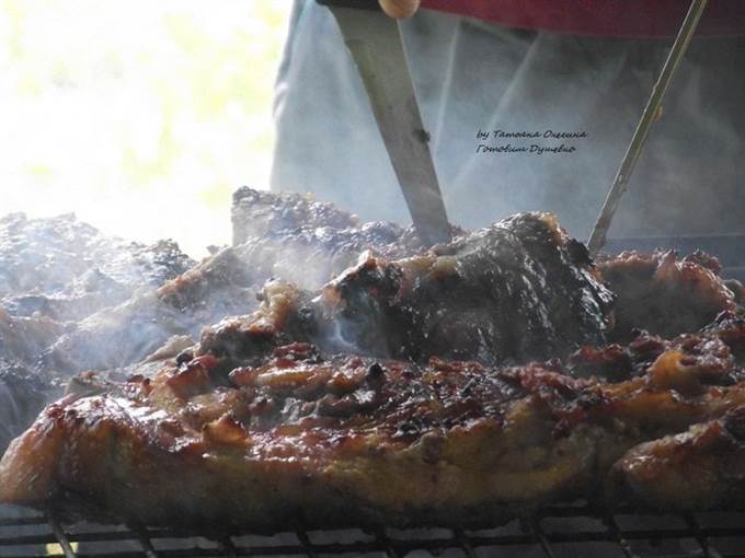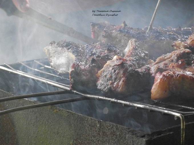 • Проверяйте готовность мяса так: если корочка уже красивая и хорошо зарумянившаяся, проверьте чтобы сок из мяса выходил прозрачный — это значит, что оно готово и ребрышки можно снимать с мангала.