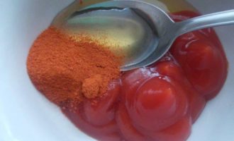 Приготовить соус, для этого взять и смешать мед, 4 ст.л. кетчупа, паприку, хорошо перемешать.