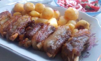 Выложить на противень и запекать при 220С полчаса, пока не появится аппетитная корочка на мясе. Можно добавить картофель, предварительно обмазав его соусом.