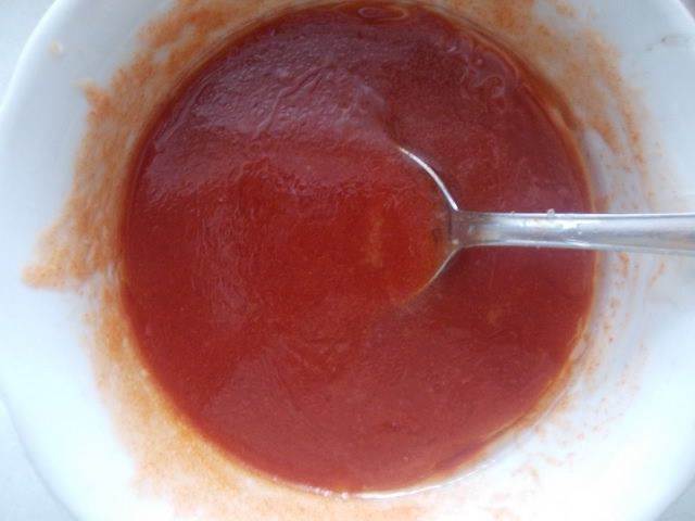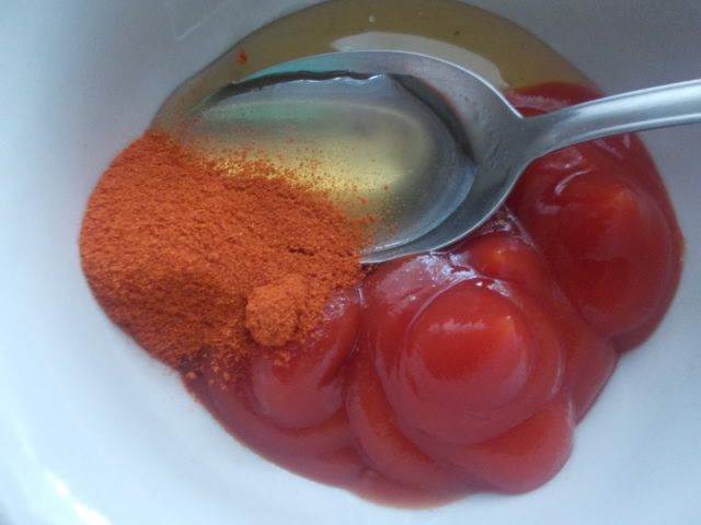 Приготовить соус, для этого взять и смешать мед, 4 ст.л. кетчупа, паприку, хорошо перемешать.