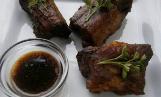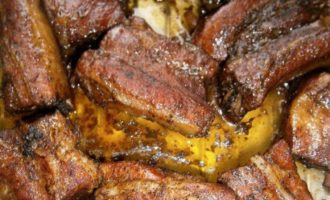 • Залить ребрышки сваренным кофе, добавить соевый соус. Накрыть форму фольгой и запекать в духовке 1 час 10 минут.