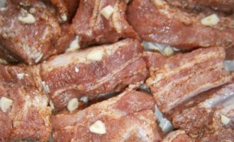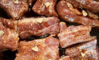 Свиные рёбрышки промыть, обсушить. Приправить солью и специями по вкусу. Выложить в форму для запекания, добавить нарезанный чеснок.