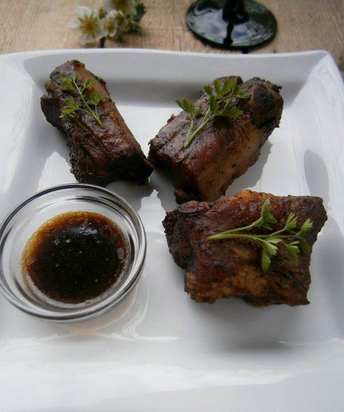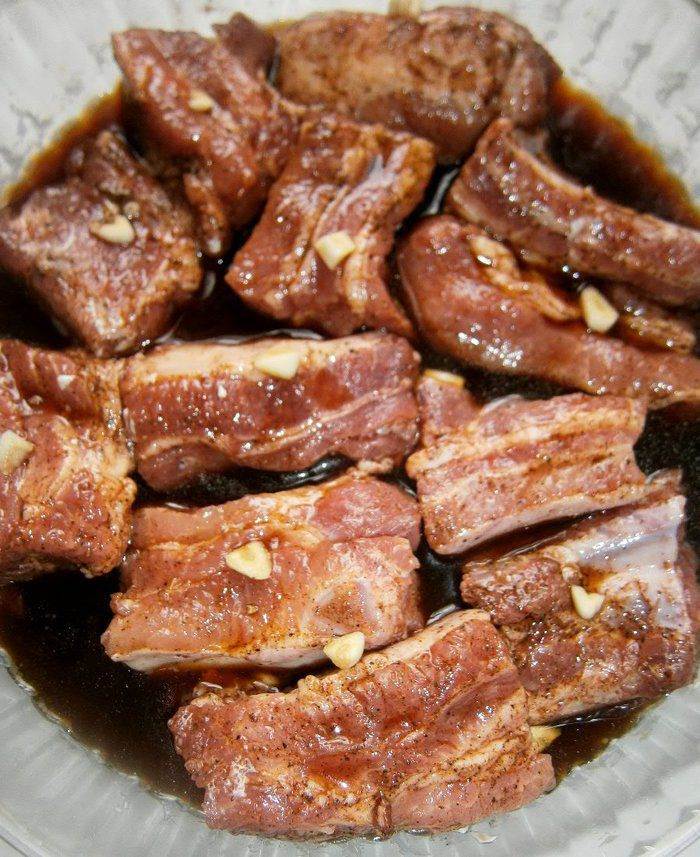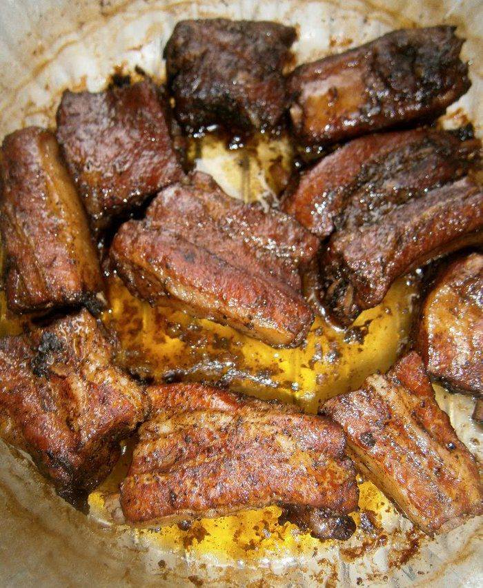 • Залить ребрышки сваренным кофе, добавить соевый соус. Накрыть форму фольгой и запекать в духовке 1 час 10 минут.