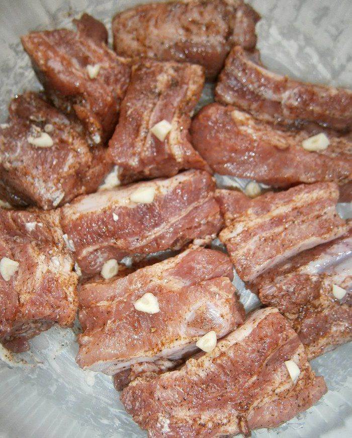 Свиные рёбрышки промыть, обсушить. Приправить солью и специями по вкусу. Выложить в форму для запекания, добавить нарезанный чеснок.