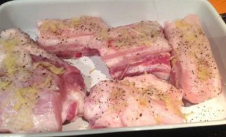 • Имбирь (кусочек 1-2 см) и чеснок почистите и натрите на мелкой терке. Ребрышки помойте, обсушите бумажным полотенцем, разрежьте на порции, натрите солью, перцем, имбирем и чесноком.