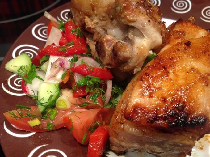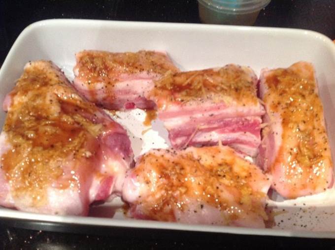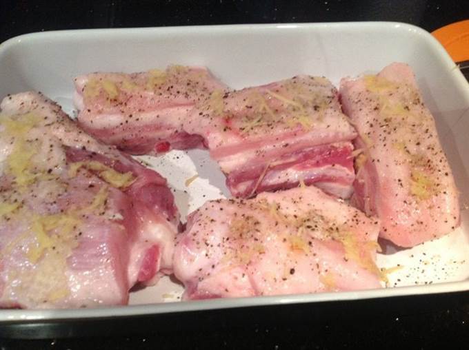 • Имбирь (кусочек 1-2 см) и чеснок почистите и натрите на мелкой терке. Ребрышки помойте, обсушите бумажным полотенцем, разрежьте на порции, натрите солью, перцем, имбирем и чесноком.