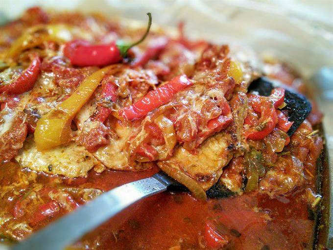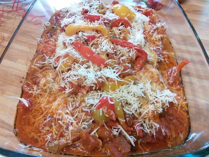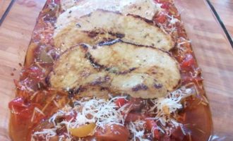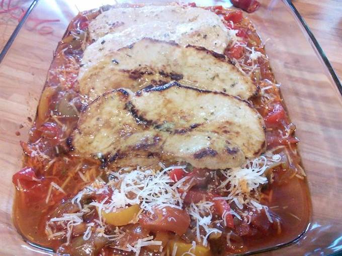 Большую форму для запекания смазать маслом, выложить 2/3 соуса, в соус выложить обжаренные шницели и полить оставшимся соусом.