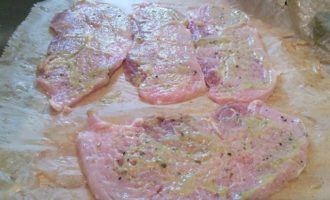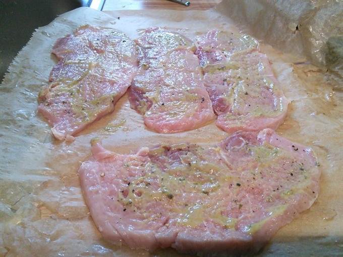 Свиную мякоть разрезать на 4 кусочка, легонько отбить, посолить и поперчить по вкусу, смазать горчицей.