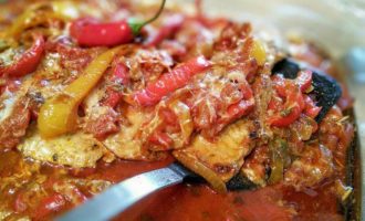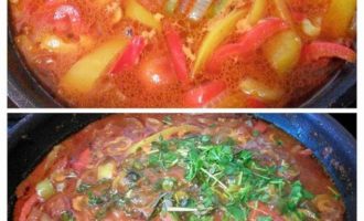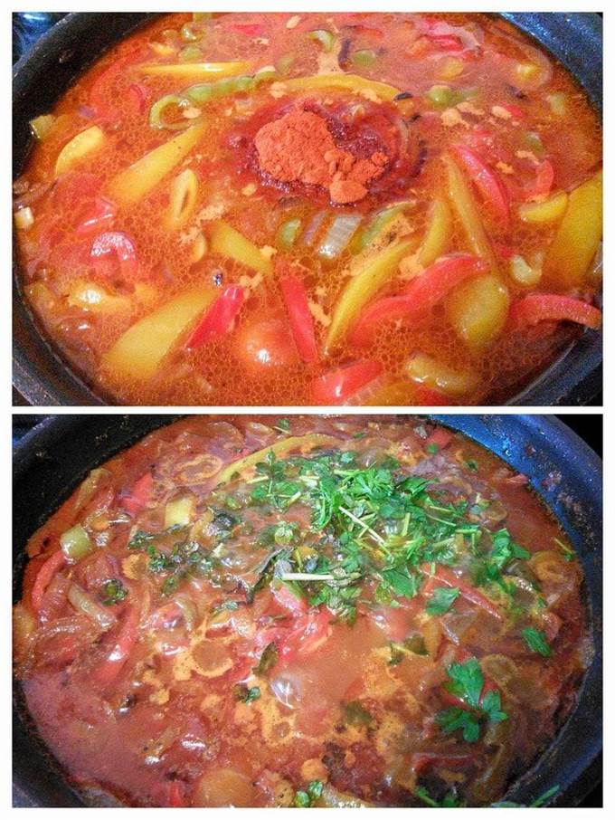 Влить пассату и бульон, довести до кипения, уменьшить огонь и тушить минут 10, добавить рубленную петрушку, если нужно досолить и доперчить, добавить сладкий порошок красной паприки.