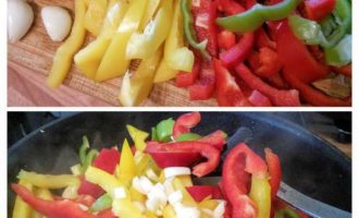 Перец болгарский (желательно разных цветов) помыть, очистить от семян и перепонок, нарезать полосками. Лук очистить и тоже нарезать полукольцами. На сковороде разогреть масло и обжарить перец и лук, мелко порубленный чеснок, посолить и поперчить, добавить майоран и перец чили.