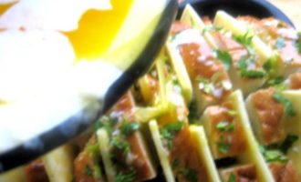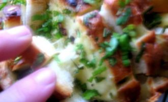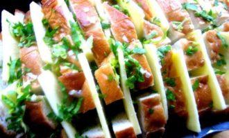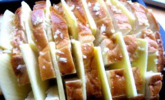 • Опять раздвигаем ломтики и сыр и насыпаем везде чесночную крошку.