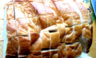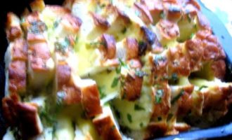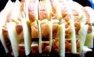 • Помещаем хлеб в смазанную форму, раздвигаем слегка куски и всовываем по два кусочка сыра между ломтями.