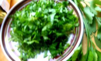 • Зелень порубить любую. Можно зелёный лук. У меня петрушка и листочки сельдерея.