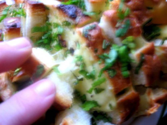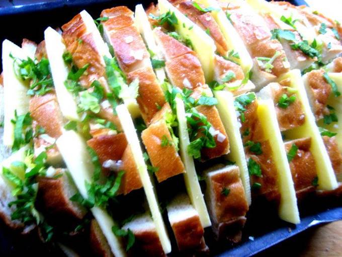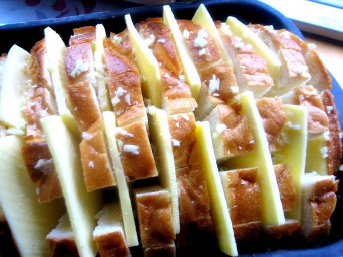 • Опять раздвигаем ломтики и сыр и насыпаем везде чесночную крошку.