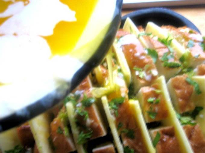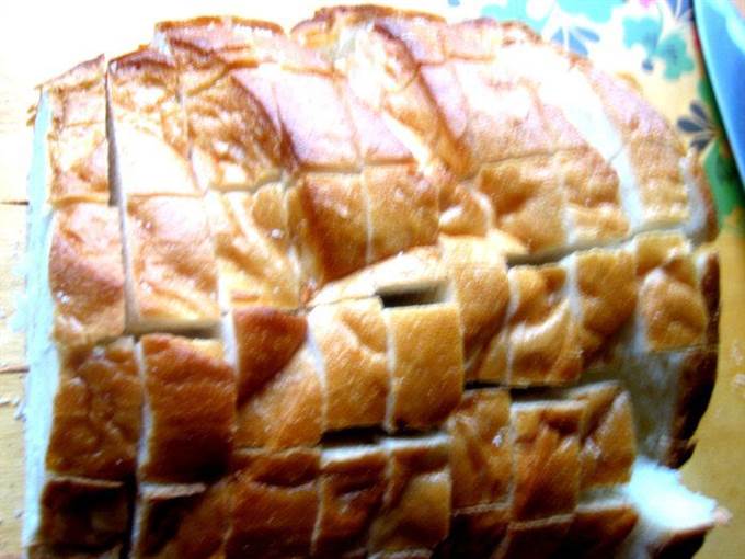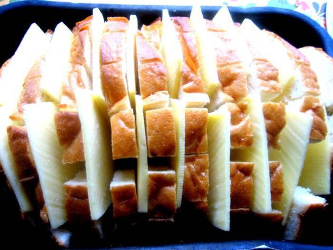 • Помещаем хлеб в смазанную форму, раздвигаем слегка куски и всовываем по два кусочка сыра между ломтями.