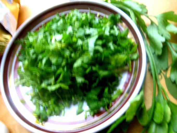 • Зелень порубить любую. Можно зелёный лук. У меня петрушка и листочки сельдерея.