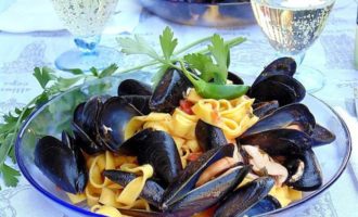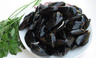 • Мидии промыть под проточной водой с щеткой, удалить водоросли, за которые мидии держались в море за камни. Положить мидии в сотейник, влить вино, закрыть крышкой, готовить 10 минут на сильном огне, переодически потряхивая сковороду. Добавить мелко порубленную петрушку.
