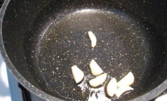 • В глубоком сотейнике разогреть оливковое масло, добавить крупно нарезанный чеснок, обжарить, затем чеснок выбросить.