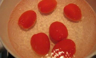 • На помидорах (у меня некрупные помидоры) сделать крестообразные надрезы, бланшировать в кипящей воде 2 минуты, снять кожицу, мелко нарезать, высыпать в сотейник, потушить на слабом огне 5 минут.