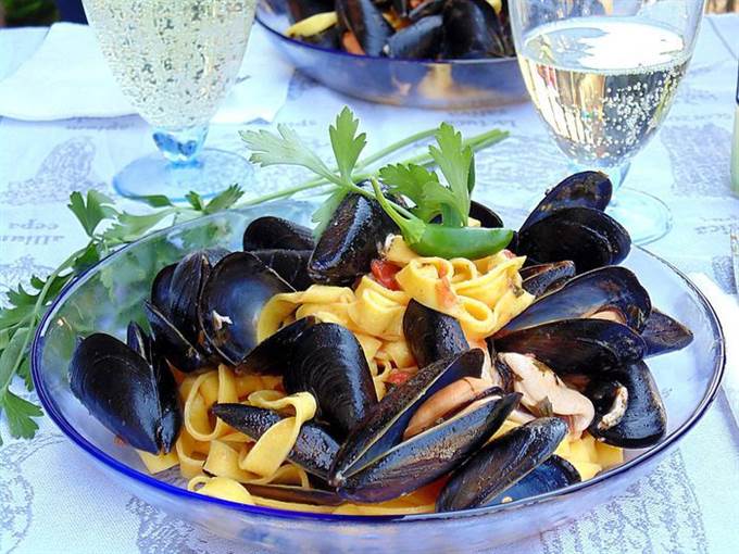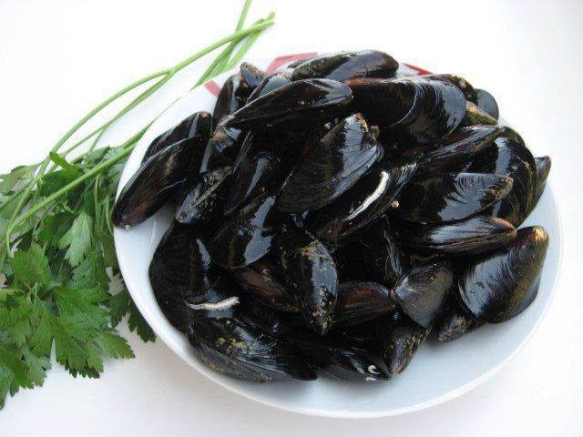 • Мидии промыть под проточной водой с щеткой, удалить водоросли, за которые мидии держались в море за камни. Положить мидии в сотейник, влить вино, закрыть крышкой, готовить 10 минут на сильном огне, переодически потряхивая сковороду. Добавить мелко порубленную петрушку.