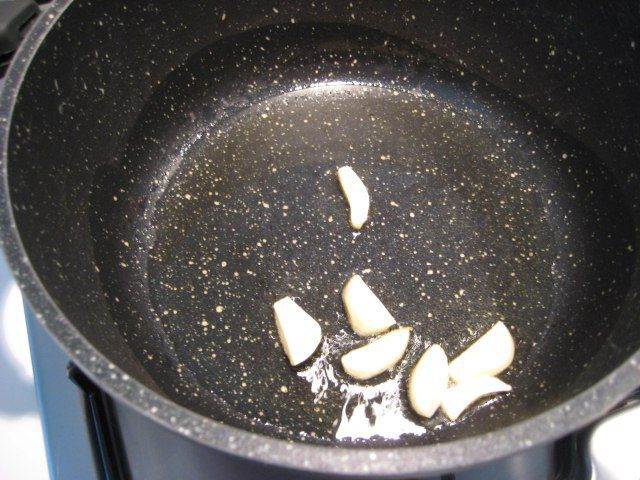 • В глубоком сотейнике разогреть оливковое масло, добавить крупно нарезанный чеснок, обжарить, затем чеснок выбросить.