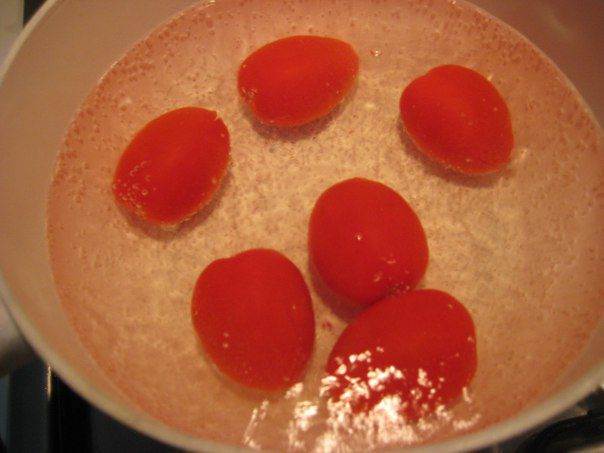 • На помидорах (у меня некрупные помидоры) сделать крестообразные надрезы, бланшировать в кипящей воде 2 минуты, снять кожицу, мелко нарезать, высыпать в сотейник, потушить на слабом огне 5 минут.