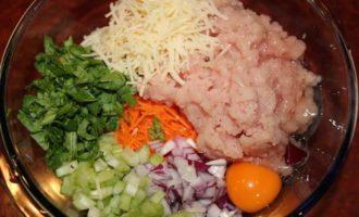 В миске смешать фарш из индейки, натёртую на тёрке тыкву и сыр, измельчённый шпинат, яйцо, половину нарезанной на кубики луковицы (у меня фиолетовая) и один стебель сельдерея. Приправить специями. Использую свой любимый карий, острый красный перец, чёрный, травы средиземноморские, тмин, кориандр. Я не солю. Готовую массу отбить как на котлеты. Скатать тефтельки смоченными в воде руками и выложить в форму для духовки. Поставить тефтельки в холодильник.