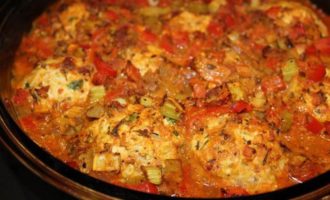 На тефтели выложить готовый соус и поставить их в духовку на 180 градусов на 40 минут.
