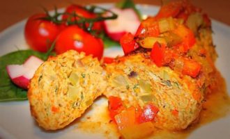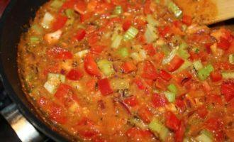 Тем временем приготовить соус. В сковородке обжарить вторую половину лука на капле оливкового масла, добавить порезанный на кубики сладкий перец и стебель сельдерея. Овощи залить томатной пастой разведённую в воде и приправленную приправами. Потомить 5 минут.