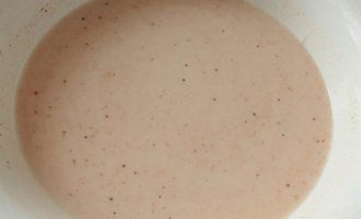 1 стакан ряженки смешать с 1 стаканом холодной кипяченой воды, добавить по вкусу соль, молотую сладкую паприку, смесь перцев, перемешать.